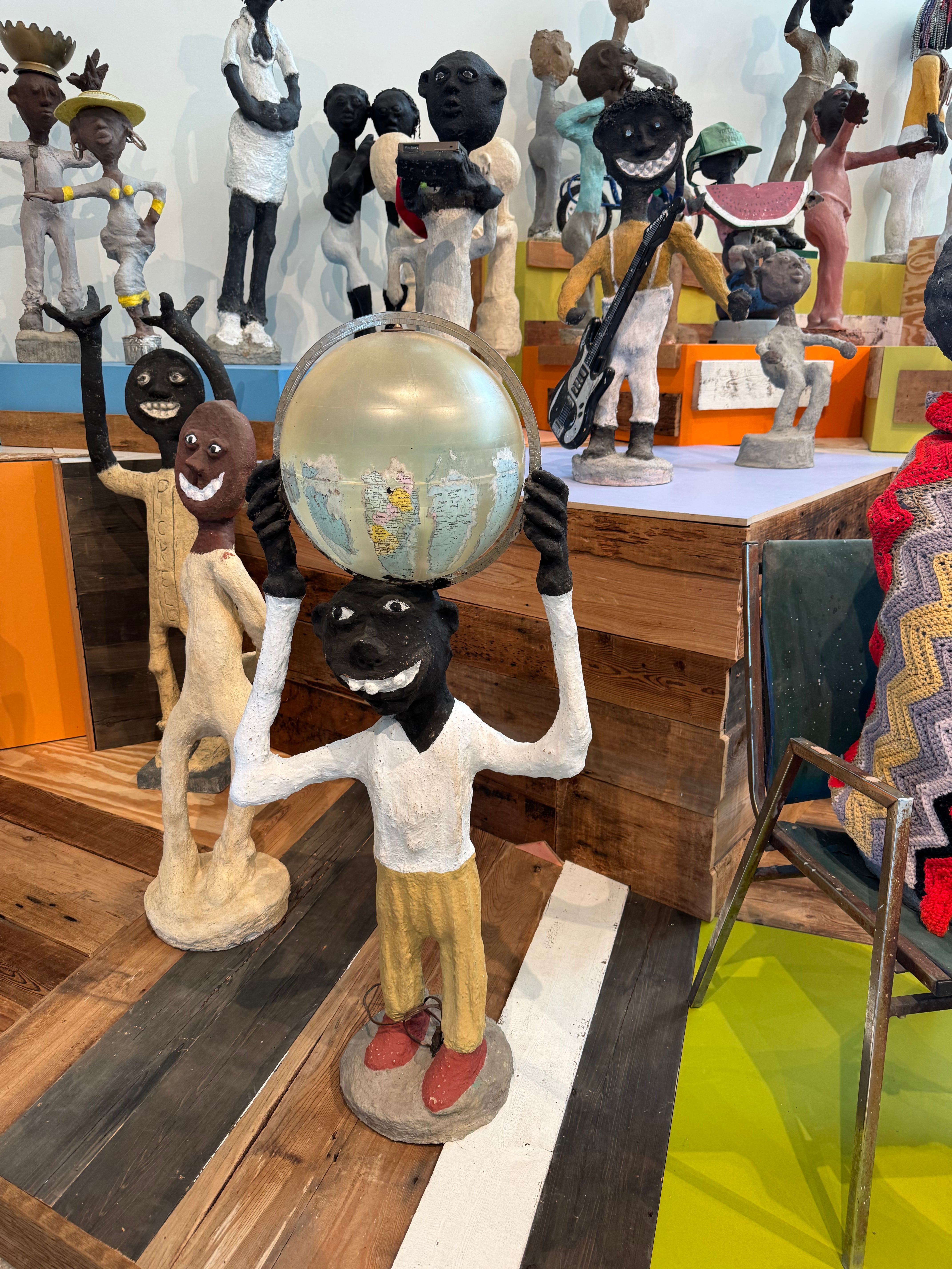 While his work takes as its subject the whole scope of Black liberatory struggle and oppression, the sculptures themselves can look like a minstrel show, with grotesque stereotypes repeating in what seems like a painful compulsion.